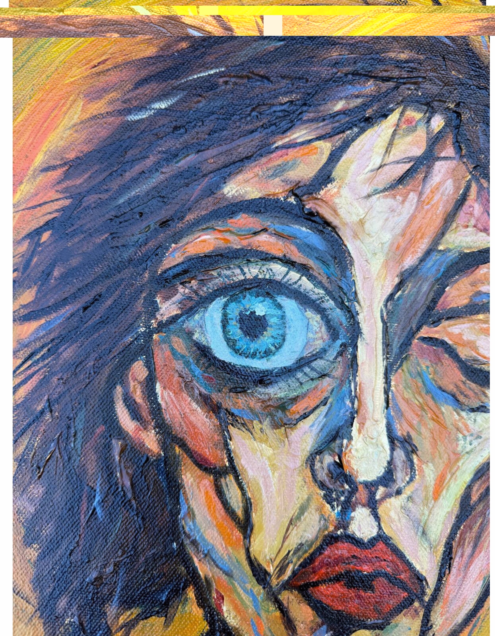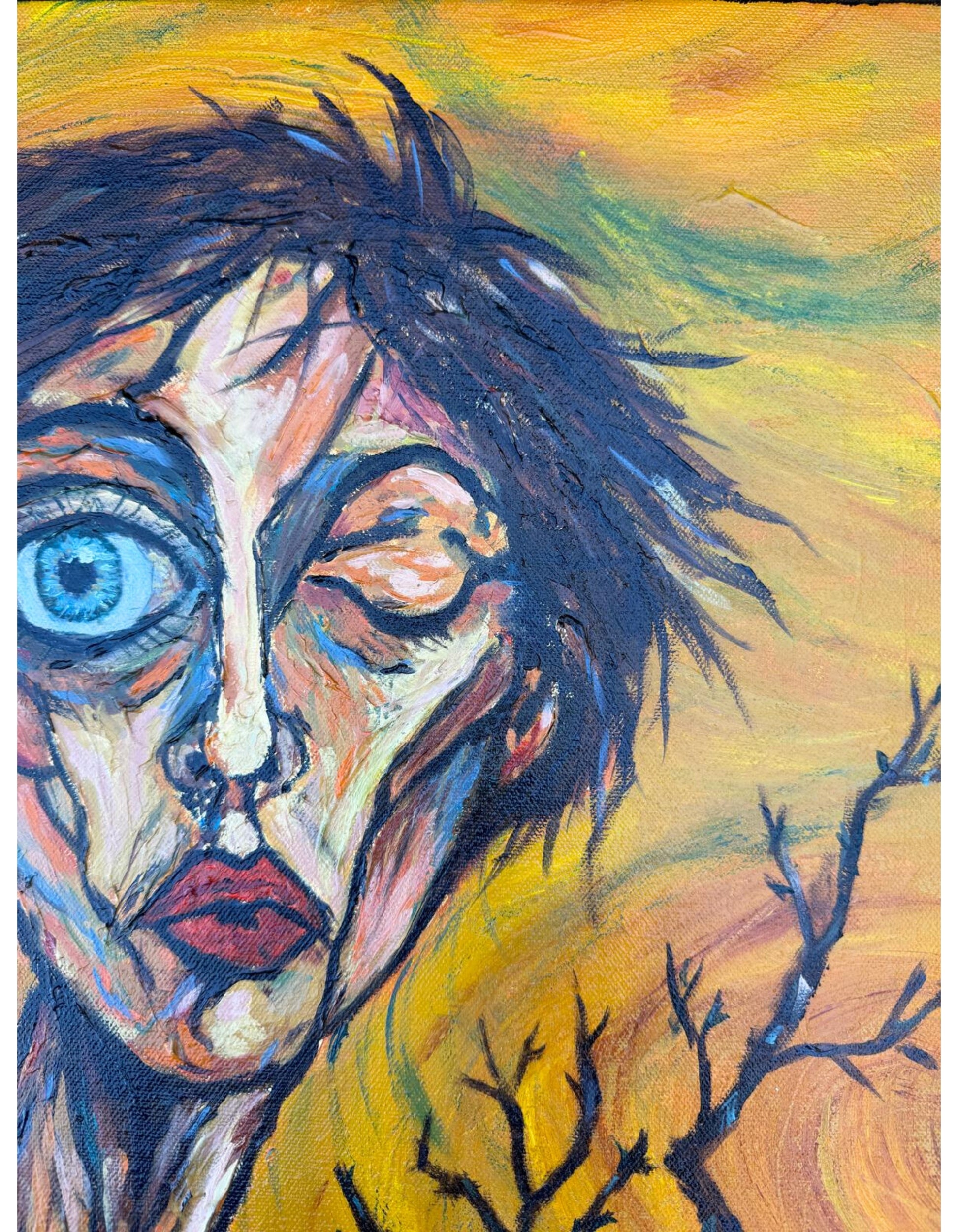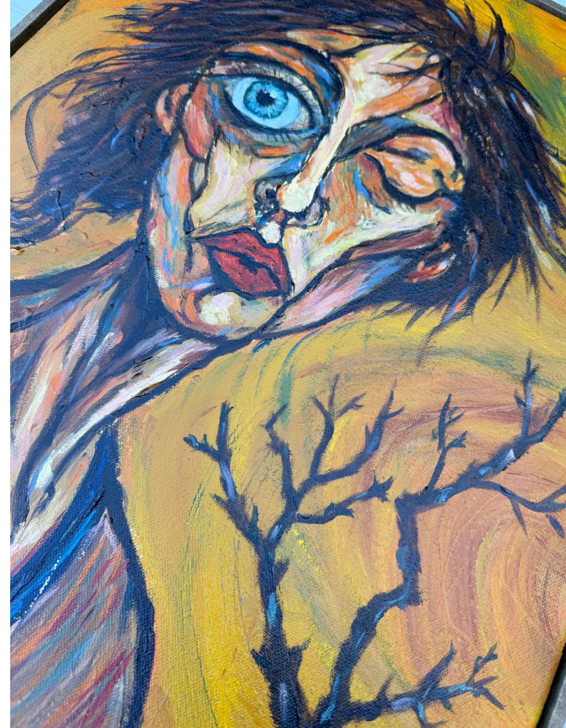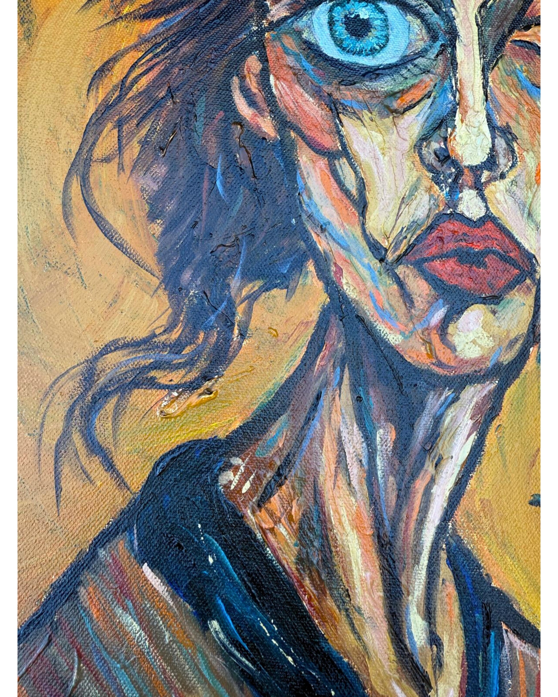 The warm background frames the figure and contrasts with the intense blue eye, which acts as the focal point.