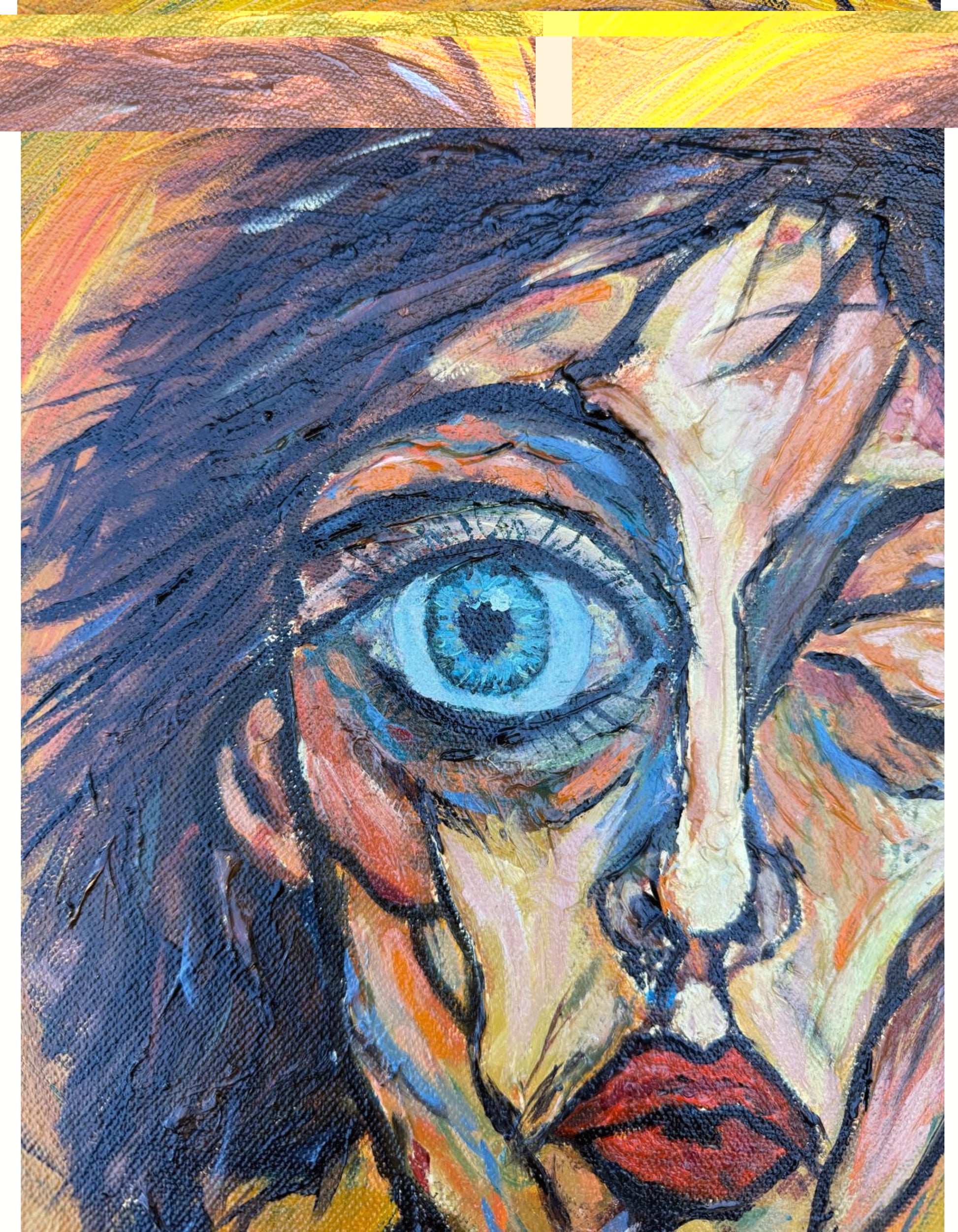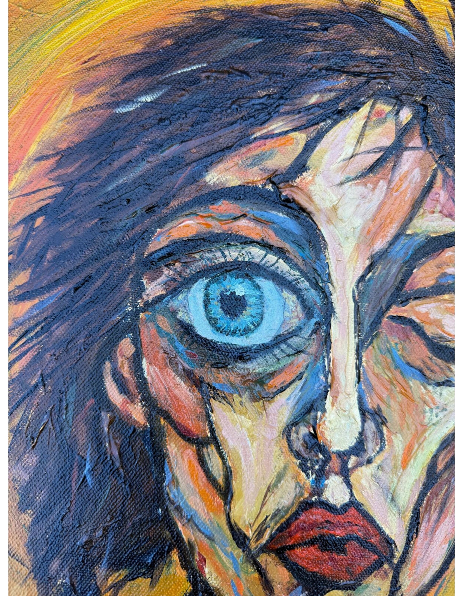 His paintings are defined by facial fragmentation, color used as message, and figures built with strong visual presence. His approach brings together gesture, texture, and structure, forming a personal language within contemporary figuration.