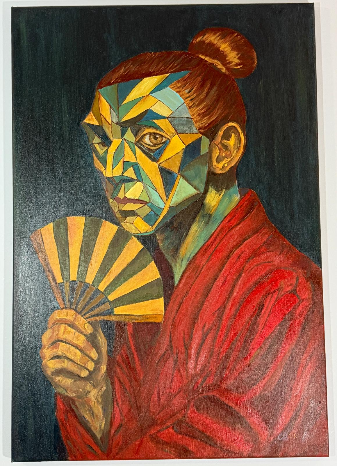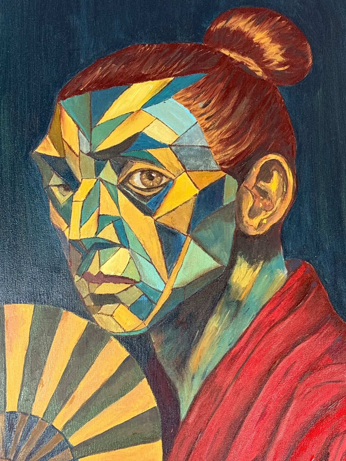 The angular planes that compose the face form a map of internal tension: areas of rupture, zones of quiet repair, fragments that reveal more than they conceal. The fan introduces a gesture of control and containment—an object functioning simultaneously as mask, boundary, and refuge.
