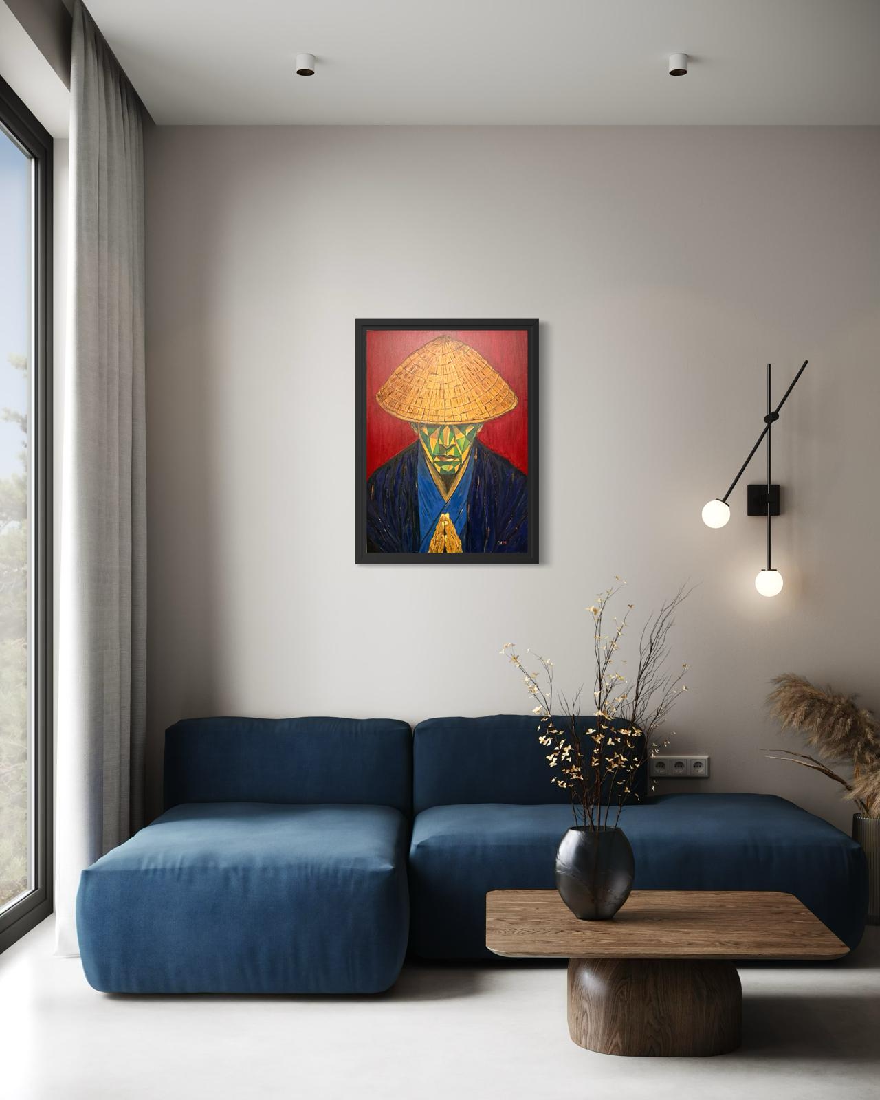The Kasa Hat: A central element charged with symbolism and technique. Texturized with a tactile density, the Kasa does not merely protect; it delimits the sacred space of thought. Its relief invites the viewer to pause and appreciate the mastery of the material.